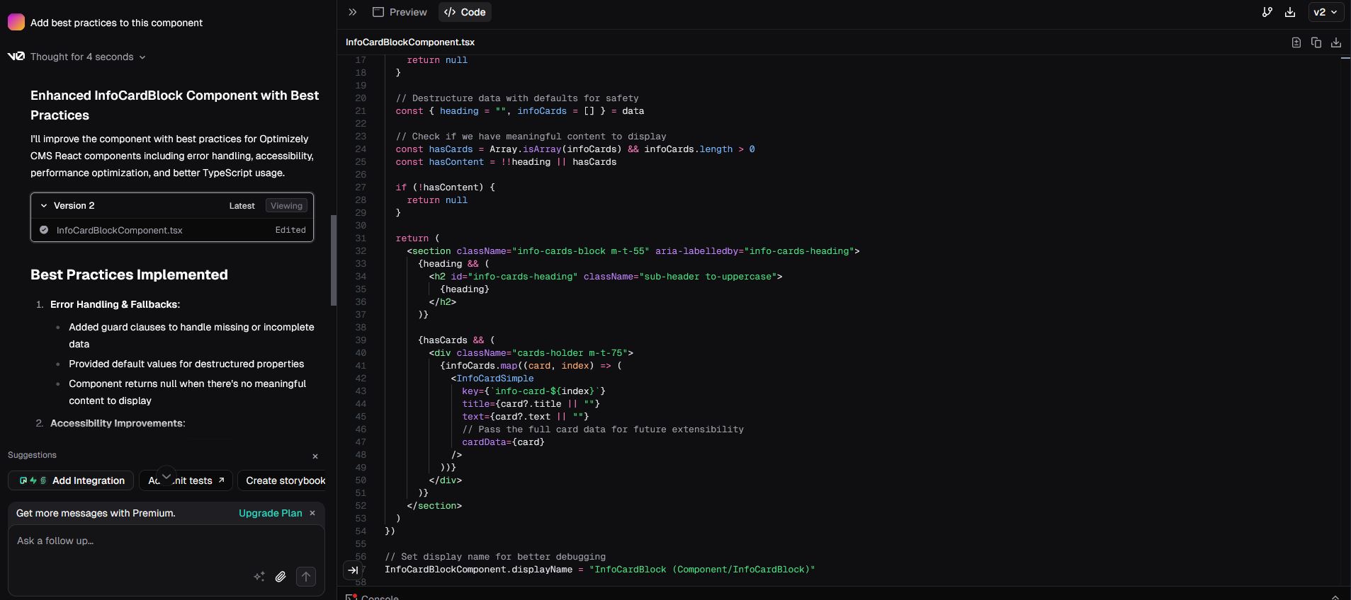 No matter how powerful AI will be, not every component will be migrated perfectly, especially complex ones involving deeply nested logic, third-party integrations, or CMS-specific traits. It’s the same for v0, so manual work will still be required. However, the more components you fine-tune and give as examples, the more robust your result becomes, allowing you to reuse those improved files as guides for the rest.